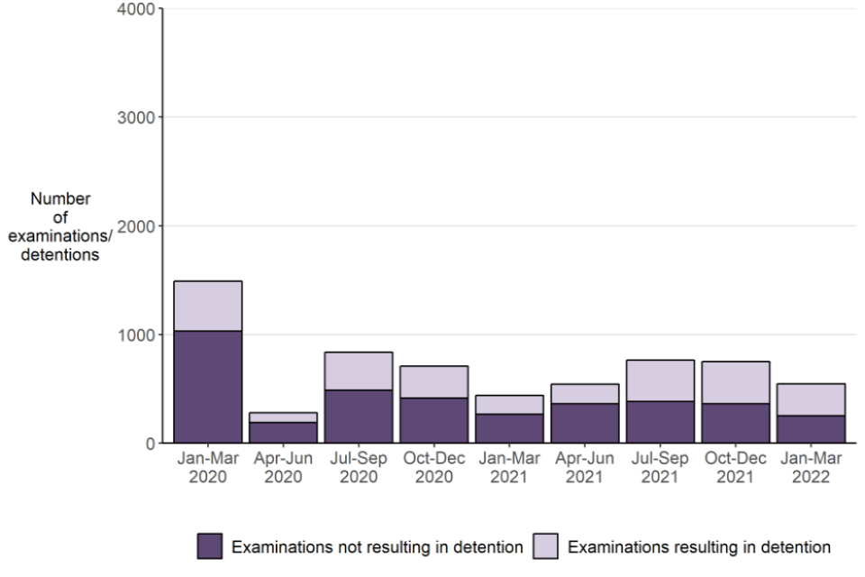 There was a large reduction in examinations under Schedule 7 of TACT 2000 between 2020 and 2021 due to the impact of the COVID-19 pandemic on international travel. Passenger numbers at air and sea ports in particular were at unprecedented low levels. This is still impacting numbers of examinations now. In the latest quarter (January to March 2022) there were 547 examinations, compared to 1,490 examinations in the same quarter in 2020; a 63% decrease . There has also been increased public scrutiny of this power in recent years, which may have driven a more targeted approach in its use. This is reflected in the increased rate of detention (see Figure 5.3).