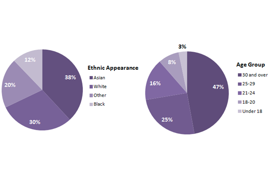Of those examined in the year ending 30 September 2014, a relatively high proportion of persons did not self-define their ethnicity at the time of search (8%); therefore proportions by ethnicity presented here exclude these persons. Of those that did self-define their ethnicity, 42% were White, 24% were Asian or Asian British, 20% were Chinese or Other, 9% were Black or Black British and 6% were of mixed ethnicity.