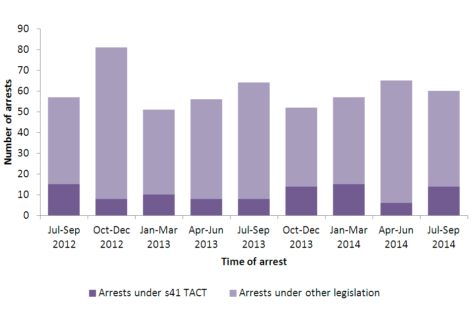 In the year ending 30 September 2014, 21% of terrorism-related arrests were under s41 TACT. In recent years, police have favoured other legislation when making terrorism-related arrests. Over the last 2 years there has been an average of 10 s41 TACT arrests per quarter, compared with 50 terrorism-related arrests under other legislation. These recent trends can be seen in contrast to the overall picture since 11 September 2001, where 62% of terrorism-related arrests have been made under s41 TACT.