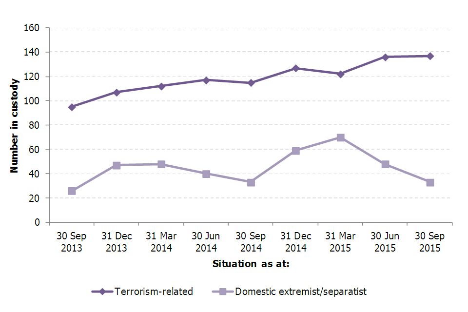 As at 30 September 2015, there were 170 persons in custody for terrorism-related offences and domestic extremism/separatism. This was an increase of 22 persons compared with the same time last year (as at 30 September 2014), but a decrease of 14 compared with the number of persons in custody at the end of the previous quarter (30 June 2015).