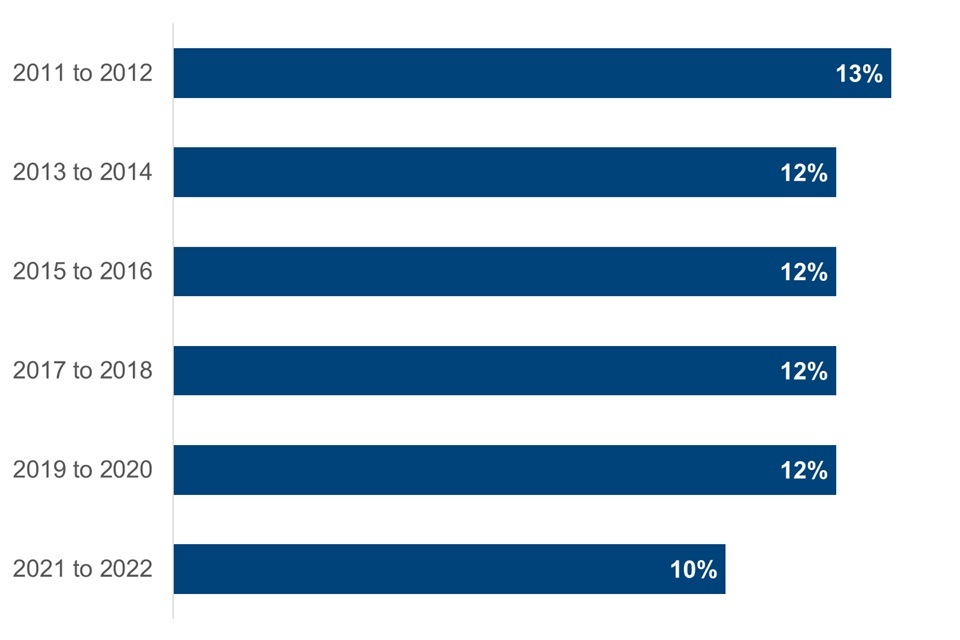 10% of children in couple-parent families had at least one parent who reported relationship distress in the 2021 to 2022 survey period, compared with 12% in 2019 to 2020. However, these figures are calculated from survey data, and we do not believe there is yet sufficient evidence to confirm a reduction in the level of parental relationship distress in the general population.