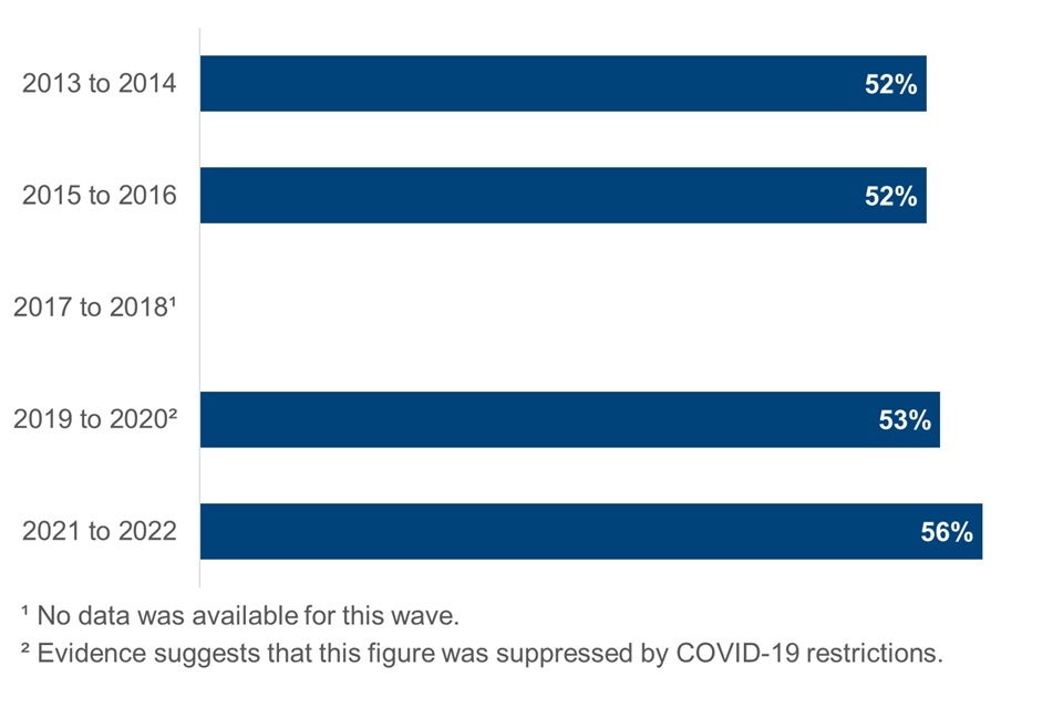 56% of children in separated families see their non-resident parent regularly, according to the latest survey data gathered in 2021 to 2022. This measure has increased by 5 percentage points since 2015 to 2016. This is likely to represent a real increase in the level of non-resident parent contact amongst separated families.