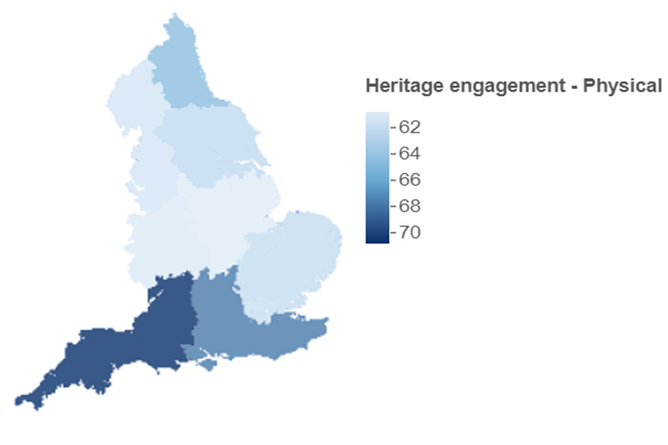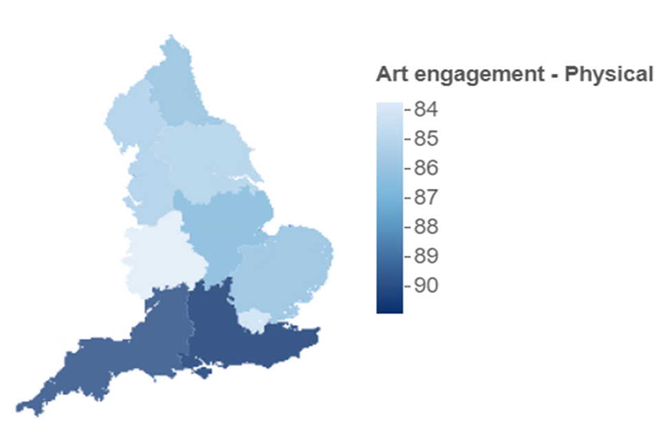 Map showing Physical arts engagement in the previous 12 months, broken down by region. The map is shaded from light to dark blue. The lightest blue region has the lowest engagement and the darkest blue has the highest.