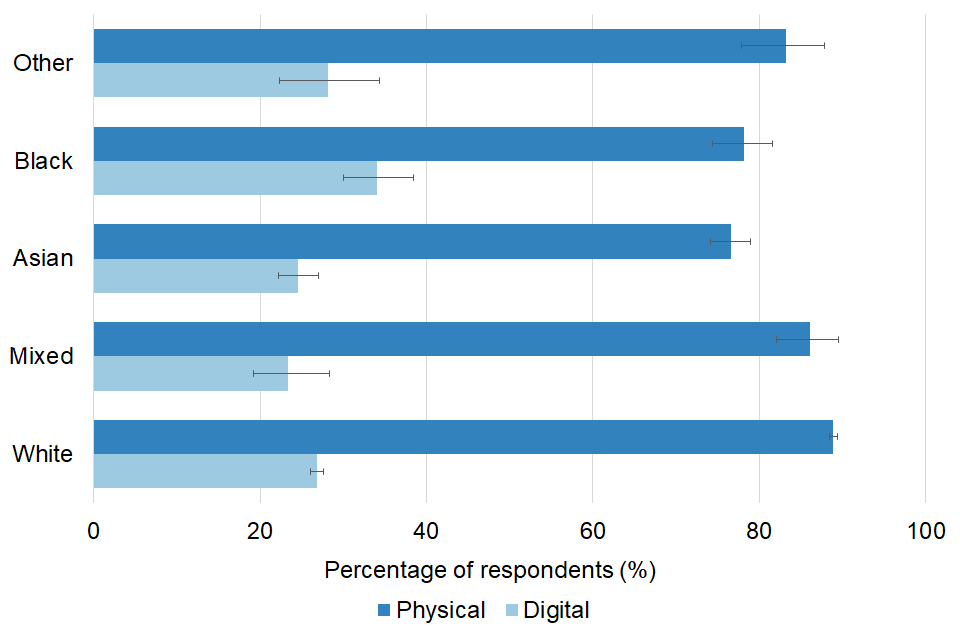 Horizontal bar chart, with error bars, showing physical and digital arts engagement, by ethnic group. The physical bars are in dark blue and the digital bars are in light blue.