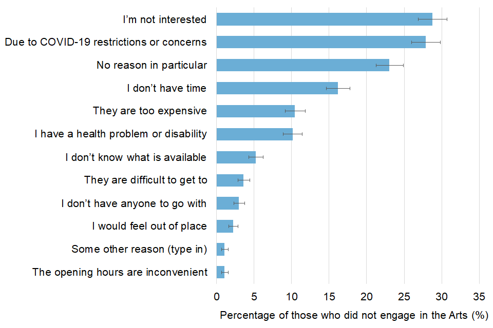 Respondents who did not attend or participate in arts events or activities were asked about the reasons why they did not.
