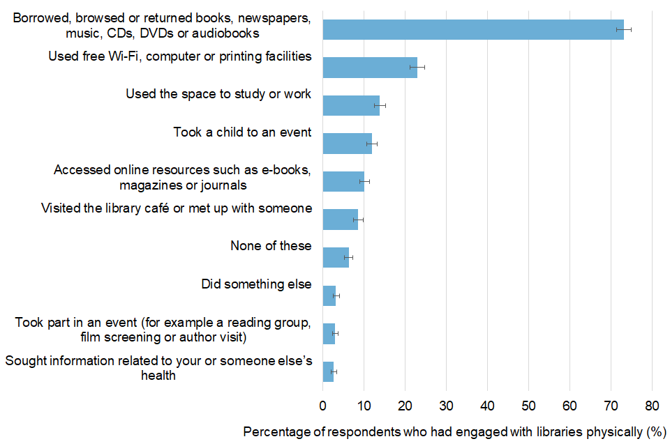 Horizontal bar chart, with error bars, showing physical library engagement, broken down by activity type, for those who had engaged physically with libraries