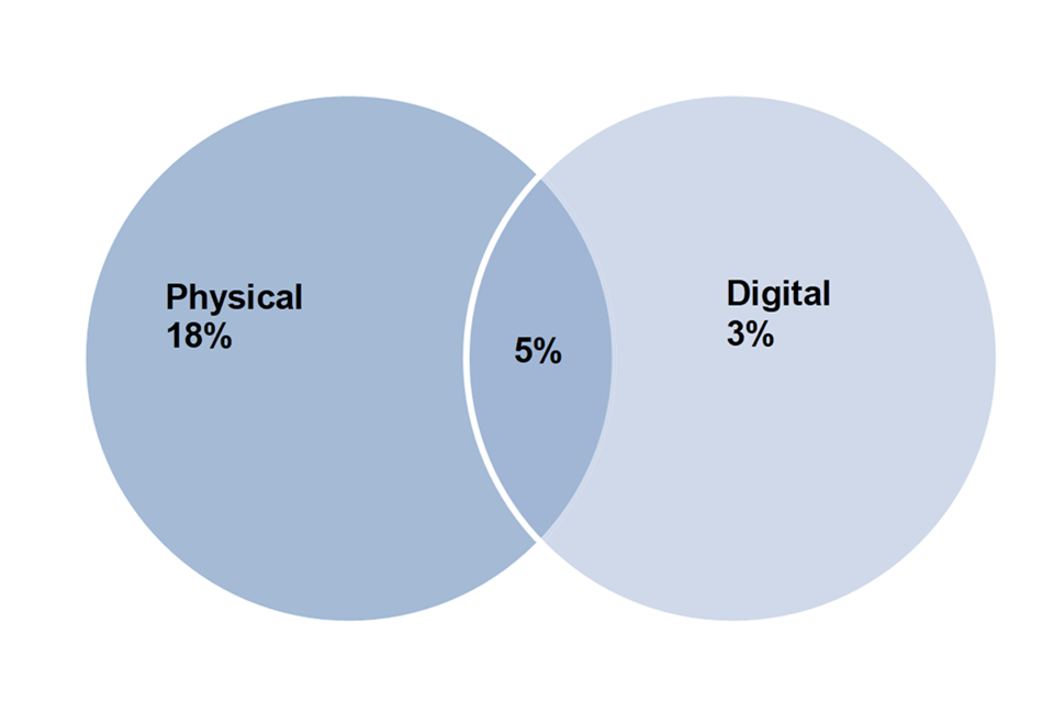 In October to December 2021, 19% of adults reported that they had engaged with a library service[footnote 6] in the previous 12 months, 14% of adults had engaged with library services physically (visited a public library building or mobile library in person at least once), whilst 12% had engaged digitally (using services digitally/online). There were 4% of adults who engaged with library services both physically and digitally in the previous 12 months.