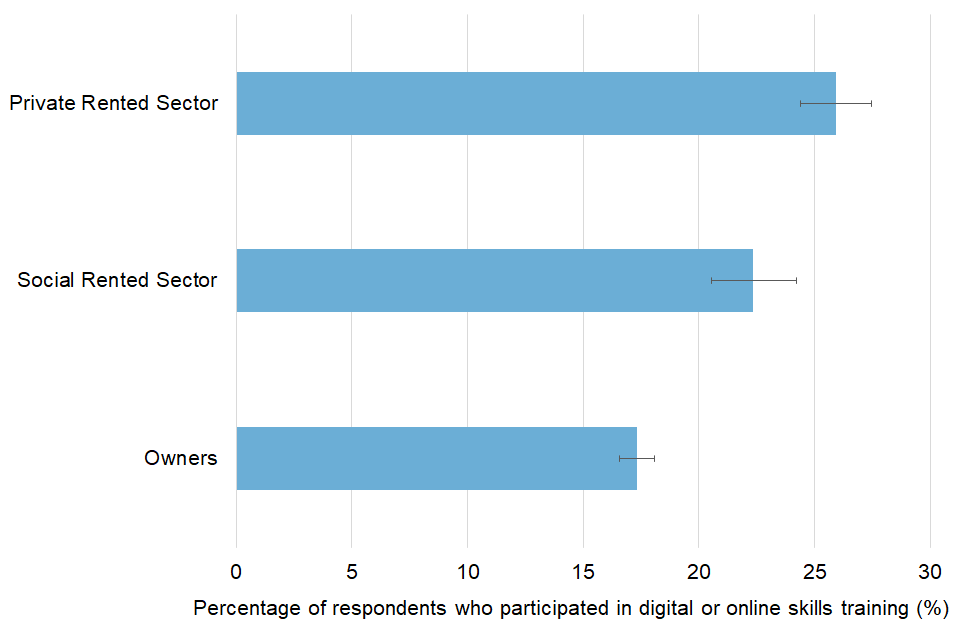 - 17% of respondents living in the Social Rented Sector engaged digitally in the arts, compared to 25% of those in the Private Rented Sector and 29% of Owners