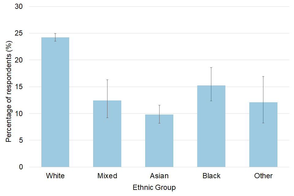 | Mixed / Multiple ethnic groups | Respondents who described their ethnic group or background as White and Black Caribbean, White and Black African, White and Asian or Any other Mixed / Multiple ethnic background. |