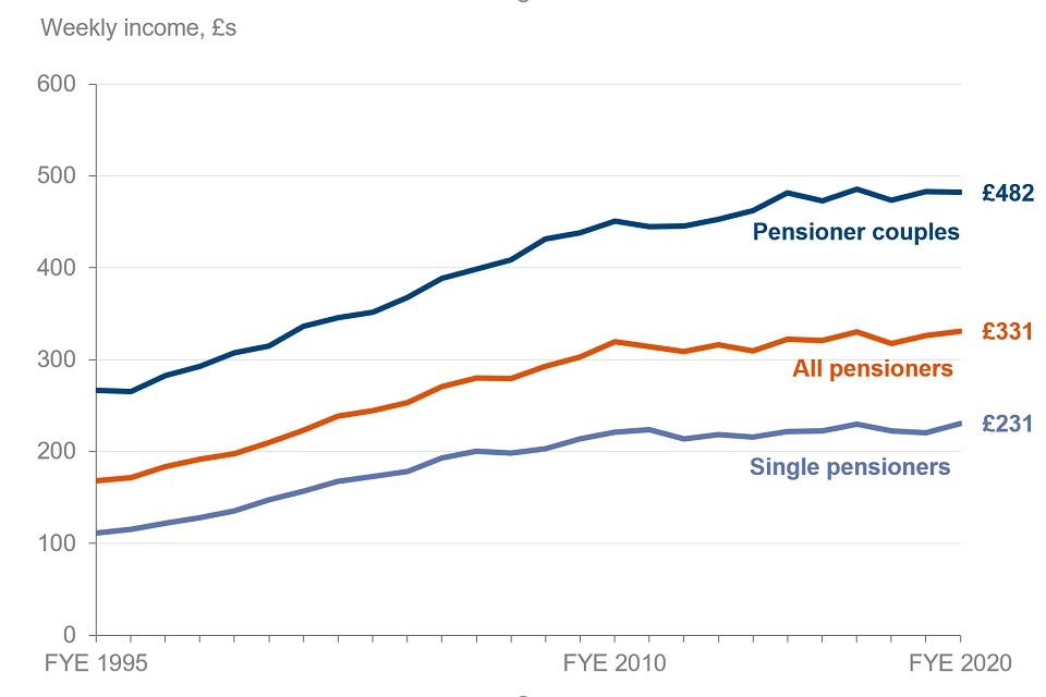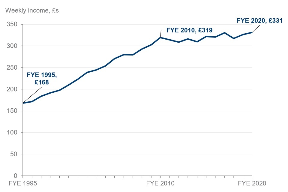 After the deduction of direct taxes, other payments such as pension contributions, and housing costs, the average income of all pensioners in FYE 2020 was £331 per week. This was similar to the average income in FYE 2010, when it was £319 per week.