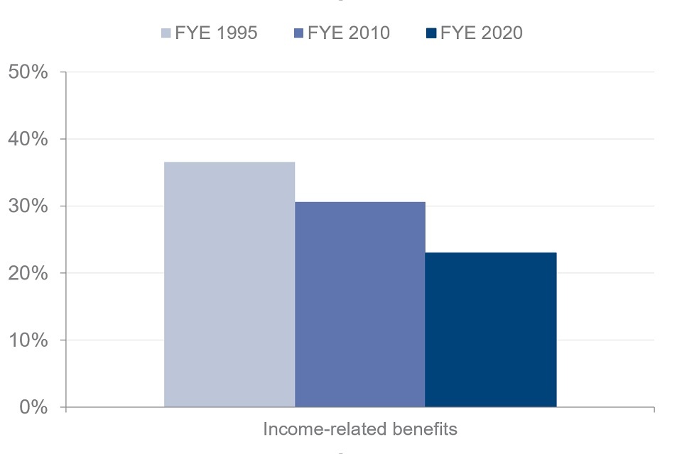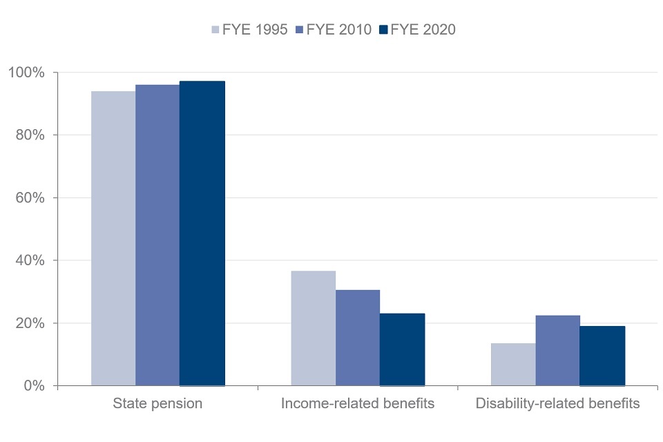 Percentage of pensioners receiving income-related benefits, financial years ending 1995, 2010 and 2020