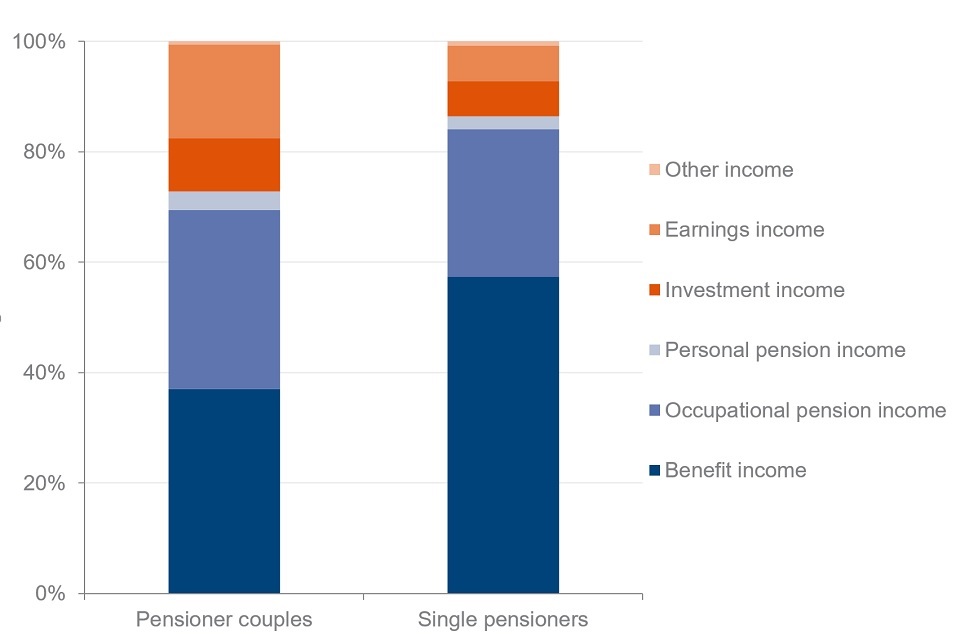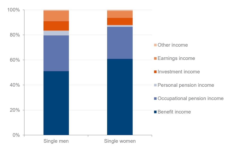 Twenty-nine per cent of total gross income for single men came from occupational pensions. For single women, this was 26%.