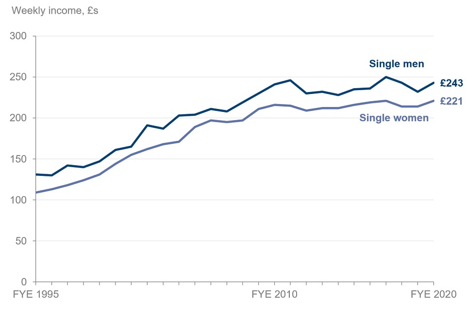 The average weekly incomes of both single men and single women were similar in FYE 2020 to what they were in in FYE 2010, when they were £241 and £216 respectively.