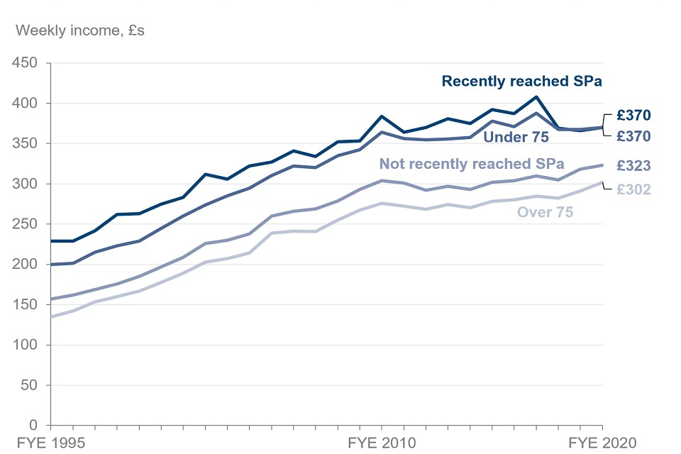 Pensioners where the head was within 5 years of the State Pension age (SPa), classified as ‘recently reached State Pension age’, had higher incomes than those who had not recently reached State Pension age. The average income for pensioners who recently reached SPa was £370, compared to £323 for those who did not reach SPa recently. This difference is statistically significant. Pensioners who recently reached SPa are also included in the ‘Under 75’ age group. These two groups have had comparable incomes in the last three years.
