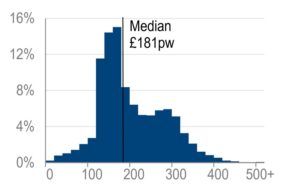 Almost all pensioners (97%) received income from State Pension, with an average amount of £181 per week. Peaks in the distribution may be explained by the basic State Pension rate, which was £129.20 per week in FYE 2020, as well as the new State Pension full rate, which was £168.60.