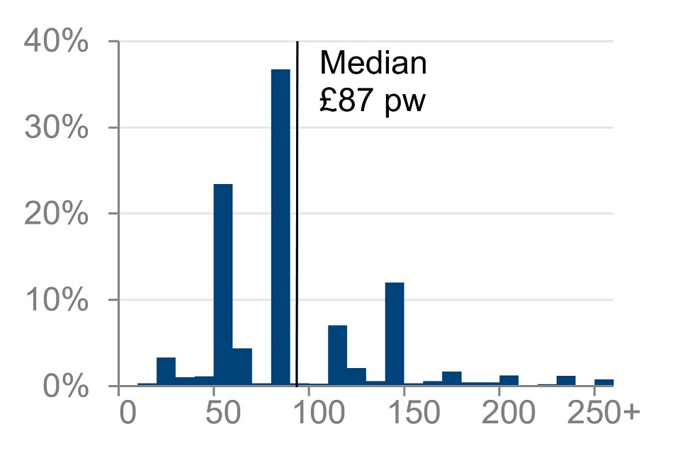 Nineteen per cent of pensioners received disability benefits. The average income for those in receipt was £87 per week. Some benefits have set rates, which may explain peaks in the distribution. For example, Attendance Allowance had a lower rate of £58.70 per week and a higher rate of £87.65 per week in FYE 2020.