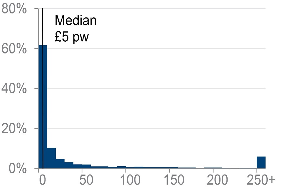 Sixty-two per cent of pensioners were in receipt of investment income, with an average income of £5 per week for those in receipt. Six per cent of these pensioners had a weekly investment income of £250 or more per week.