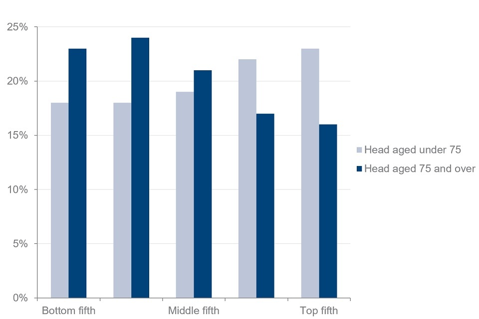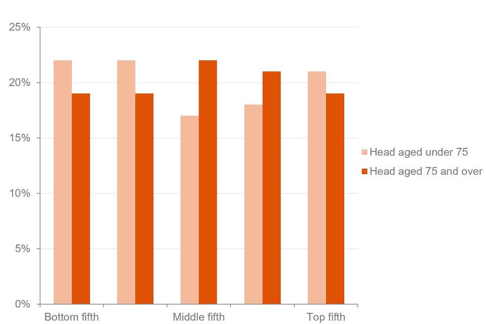 In FYE 2020, 23% of pensioner couples where the head was 75 or over were in the bottom fifth of the pensioner couples’ income distribution. Of couples where the head was under 75, 18% of couples were in the bottom fifth. The top fifth of the income distribution contained 16% of pensioner couples where the head was 75 or over. Twenty-three per cent of pensioner couples with the head under 75 were in the top fifth. This difference is statistically significant.