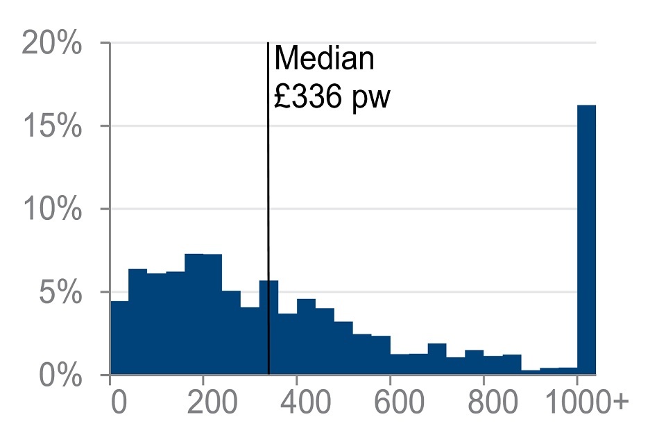 Fifteen per cent of pensioners were in receipt of earnings, with an average income for those in receipt of £336 per week. Sixteen per cent of these pensioners had earnings income of £1,000 or more per week.