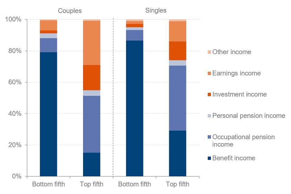 For the top fifth of both couples and singles, the largest source of income was occupational pension income (36% for couples and 41% for singles). For both couples and singles, the top fifth of the income distribution received a larger percentage of their income from earnings than any other quintile (28% for couples and 13% for singles).