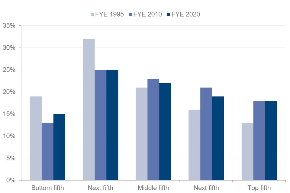 The percentage of pensioners in each fifth of the overall population income distribution (AHC), using equivalised income, financial years ending 1995, 2010 and 2020