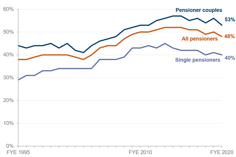 The percentage of pensioners in receipt of income-related benefits in FYE 2020 was 23%. This has been decreasing since the survey began in FYE 1995 when 37% of pensioners were in receipt of such benefits.