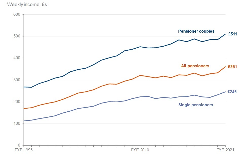 After the deduction of direct taxes, and housing costs, the average income of all pensioners in FYE 2021 was £361 per week.