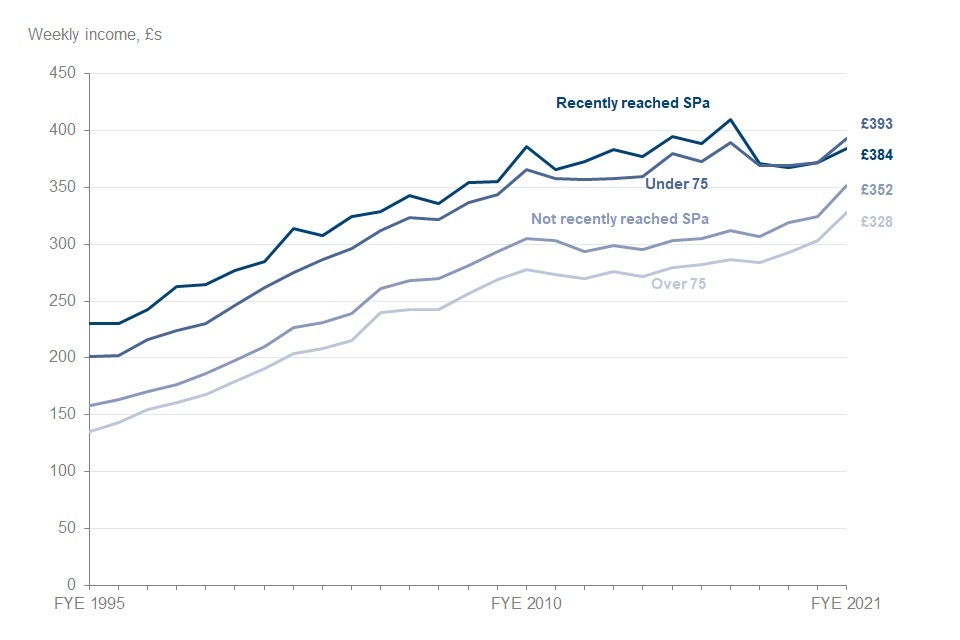 Pensioners where the head was within 5 years of the State Pension age (SPa), classified as ‘recently reached State Pension age’, had higher incomes than those who had not recently reached State Pension age. The average income for pensioners who recently reached SPa was £384, compared to £352 for those who did not reach SPa recently. Pensioners who recently reached SPa are also included in the ‘Under 75’ age group. These two groups have had comparable incomes in the last three years.