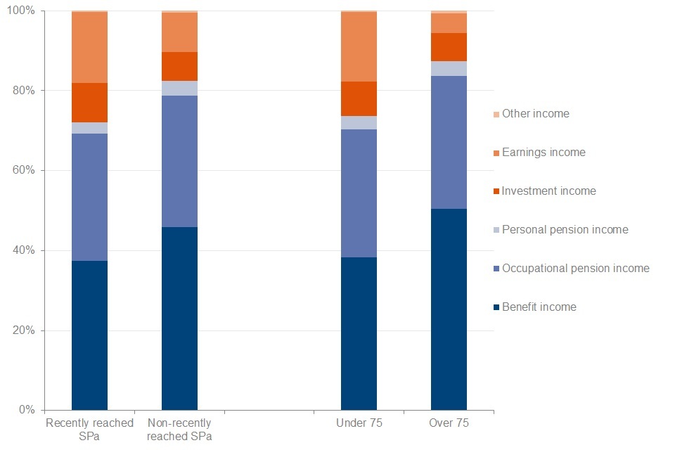 Pensioners who had recently reached SPa and those that were under 75 had more investment income, with 10% and 9% of total gross income respectively. Pensioners over 75 and those who had not recently reached SPa received 7% of their total gross income from investments.