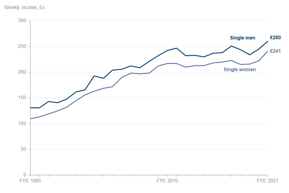 Single male pensioners had higher average incomes than single female pensioners in FYE 2021. Single men had an average weekly income of £260 and single women had an average income of £241.