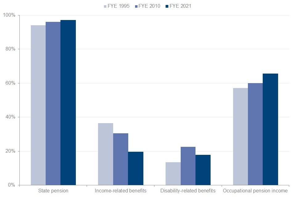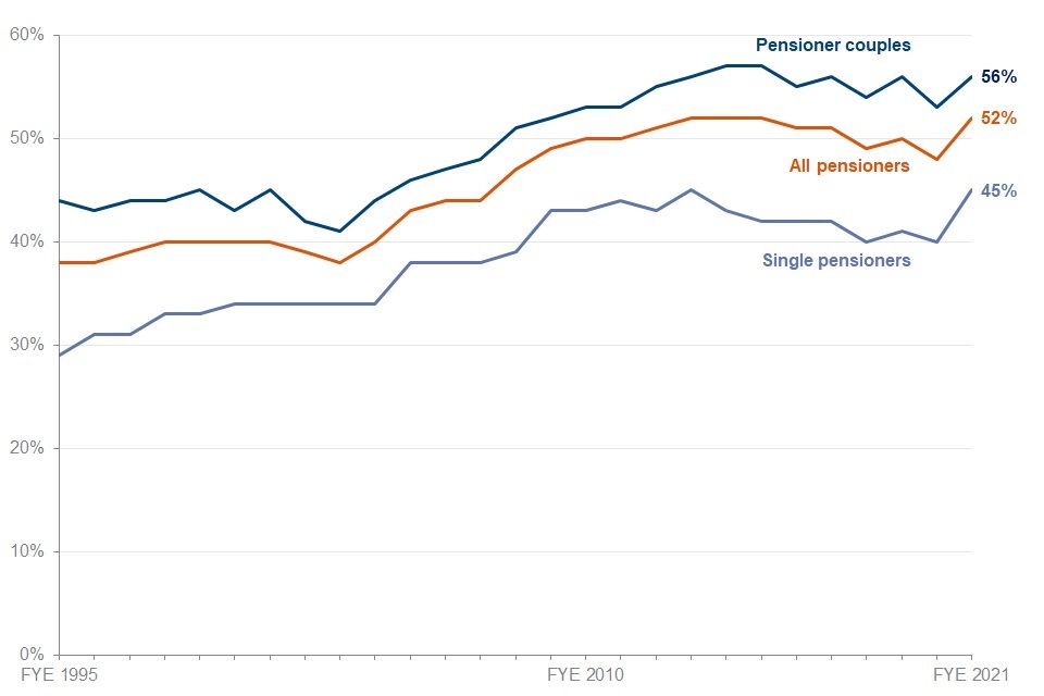 Percentage of pensioners receiving income-related benefits, financial years ending 1995, 2010 and 2021