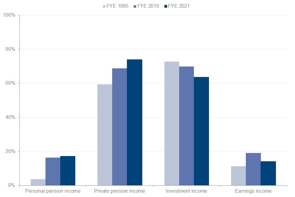 Pensioners receive income from a range of different sources. Changes in the composition of pensioners’ incomes reflect underlying economic factors.
