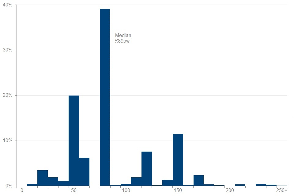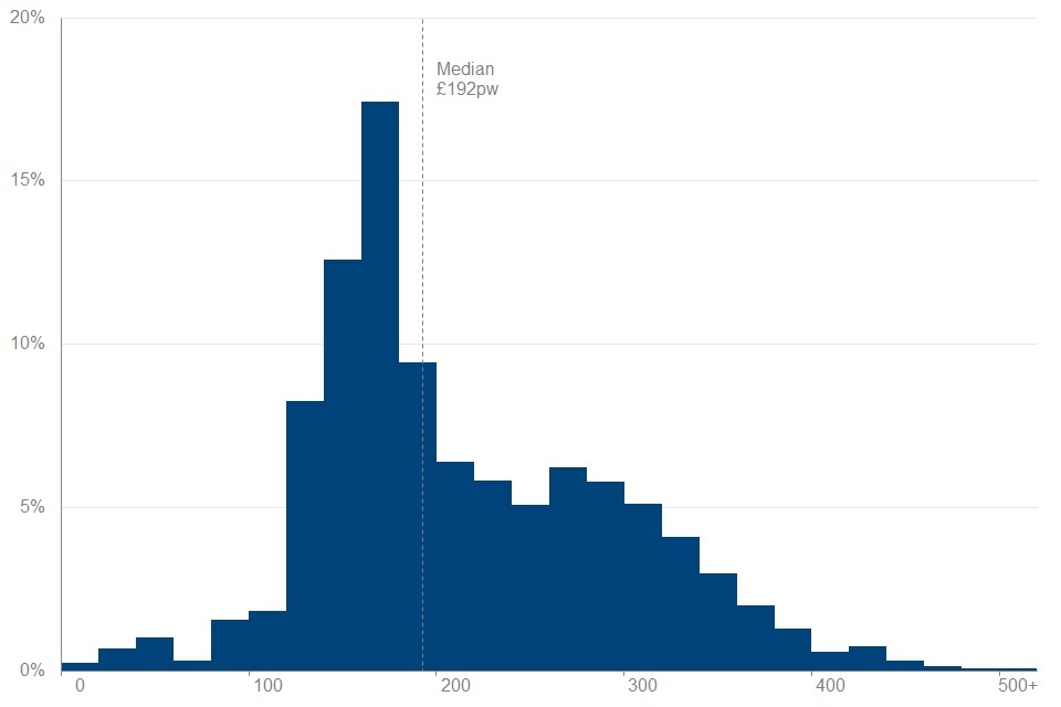 Almost all pensioners (97%) received income from State Pension, with an average amount of £192 per week. Peaks in the distribution may be explained by the basic State Pension rate, which was £134.25 per week in FYE 2021, as well as the new State Pension full rate, which was £175.20.