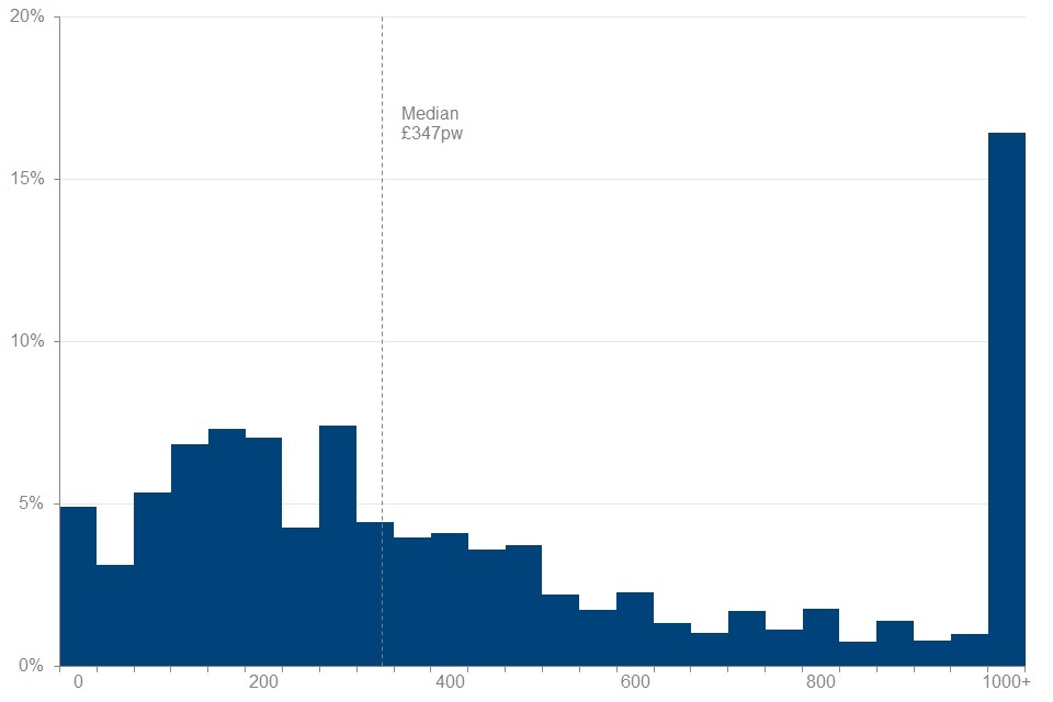 Fourteen per cent of pensioners were in receipt of earnings, with an average income for those in receipt of £347 per week. Sixteen per cent of these pensioners had earnings income of £1,000 or more per week.