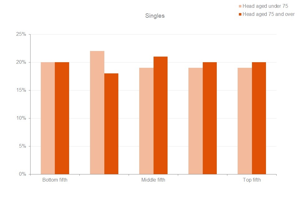 Twenty per cent of single pensioners aged under 75, and those that were aged 75 and over, were in the bottom fifth of the pensioner singles income distribution. The top fifth of the income distribution contained 19% of single pensioners aged under 75 and 20% of single pensioners 75 or over.