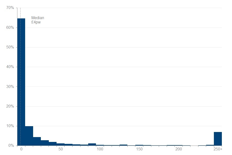 Sixty-four per cent of pensioners were in receipt of investment income, with an average income of £4 per week for those in receipt. Seven per cent of these pensioners had a weekly investment income of £250 or more per week.
