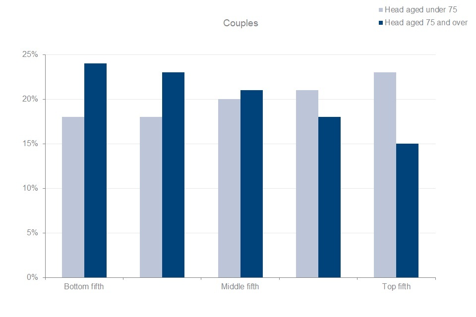 In FYE 2021, 24% of pensioner couples where the head was 75 or over were in the bottom fifth of the pensioner couples’ income distribution. Of couples where the head was under 75, 18% of couples were in the bottom fifth. The top fifth of the income distribution contained 15% of pensioner couples where the head was 75 or over. Twenty-three per cent of pensioner couples with the head under 75 were in the top fifth. This difference is statistically significant.