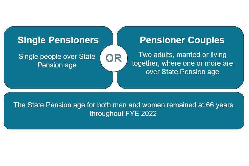 Benefit units who are a pensioner couple, single male pensioner, or single female pensioner. Pensioner benefit units may also include any dependent children, but this is uncommon. In FYE 2022, just over half a per cent of pensioner units included dependent children.