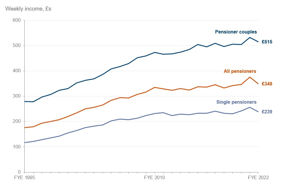 After the deduction of direct taxes, and housing costs, the average income of all pensioners in FYE 2022 was £349 per week.