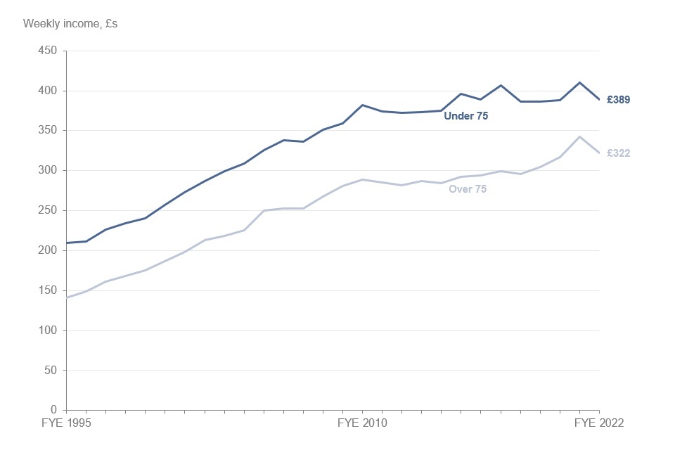 In FYE 2022, pensioners where the head was under 75 had average weekly incomes of £389. This was higher than those where the head was 75 or over, who had average weekly incomes of £322. This difference is statistically significant.