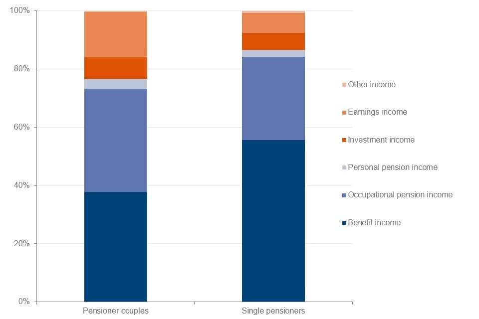 In FYE 2022, benefit income, which includes State Pension, was the largest component of total gross income for both pensioner couples and single pensioners. This was 56% for single pensioners, while for pensioner couples it was 38%.