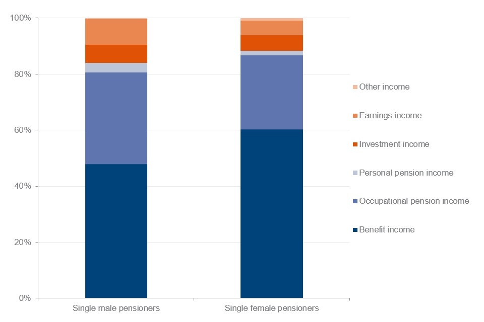 The difference in incomes between single male and single female pensioners reflects differences in the components that make up individuals’ total gross income.