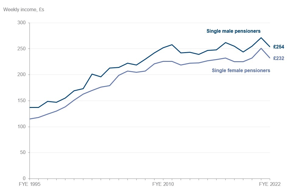 Average weekly income of pensioners (AHC) by gender in FYE 2022 prices (£)
