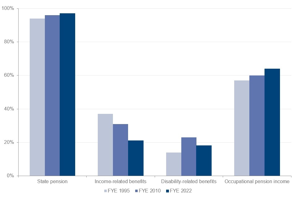 Occupational pension income was received by 64% of pensioners in FYE 2022. FYE 1995 and FYE 2010 saw 57% and 60% respectively. The overall increase between FYE 1995 and FYE 2022 is statistically significant.