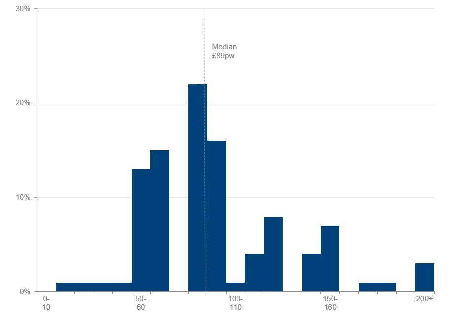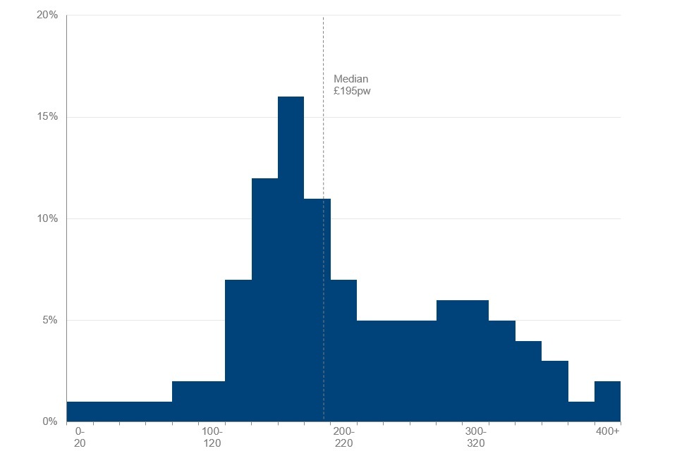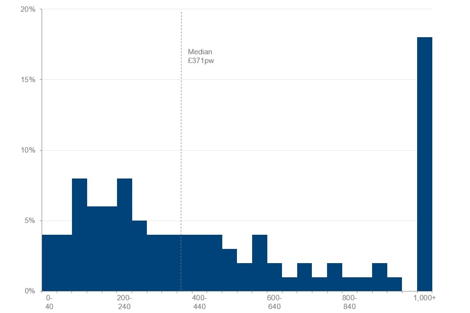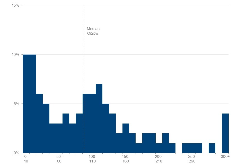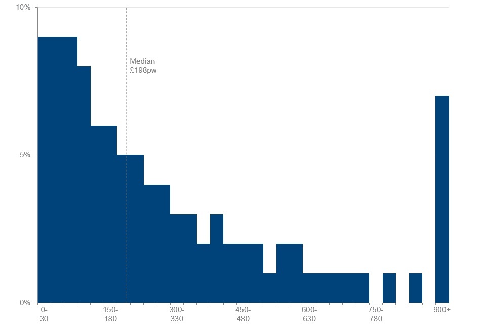 Almost all pensioners (97%) received income from State Pension, with an average amount of £195 per week. Some peaks in the distribution may be explained by the basic State Pension rate, which was £137.50 per week in FYE 2022, as well as the new State Pension full rate, which was £179.60.