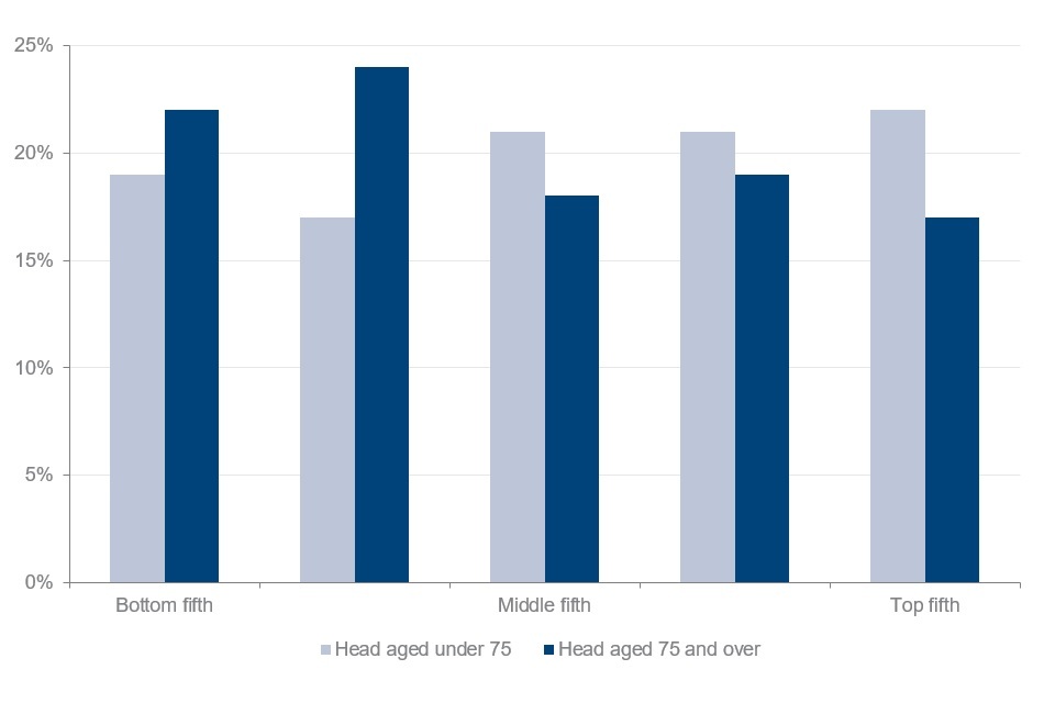 In FYE 2022, 22% of pensioner couples where the head was 75 or over were in the bottom fifth of the pensioner couples’ income distribution. Of couples where the head was under 75, 19% of couples were in the bottom fifth. The top fifth of the income distribution contained 17% of pensioner couples where the head was 75 or over. Of couples where the head was under 75, 22% of couples were in the top fifth. This difference is statistically significant.