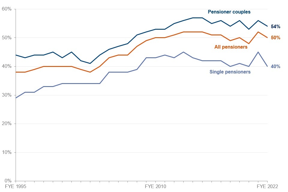 The percentage of single pensioners in the top half of income distribution was 40% in FYE 2022. In FYE 1995, this was 29%. This difference is statistically significant.