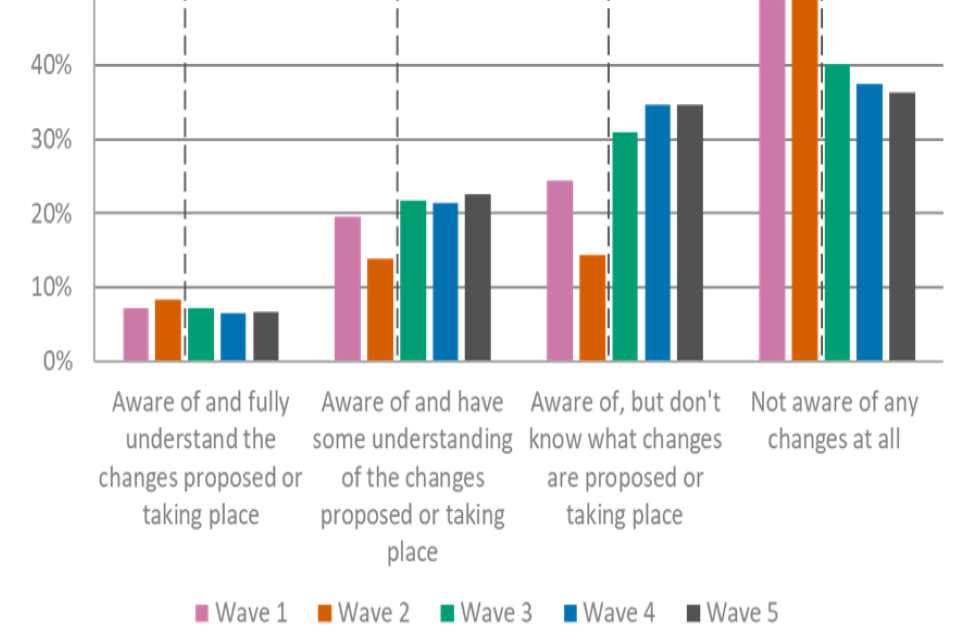 Additionally, roughly three-fifths (64%, 63% in wave 4) of employers said they were aware of the changes that have been or are currently being made to VTQs. Fewer (7%) employers were aware and said they fully understand the changes that are proposed or taking place.