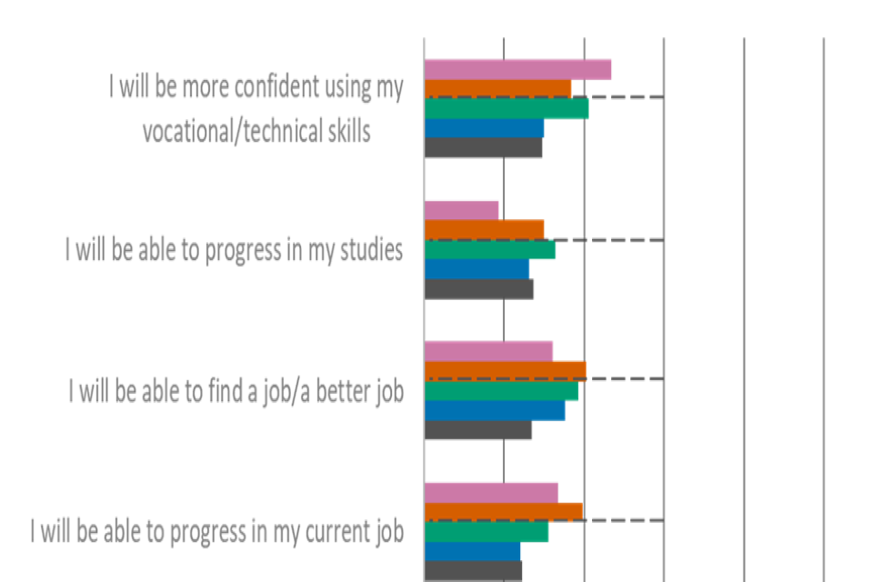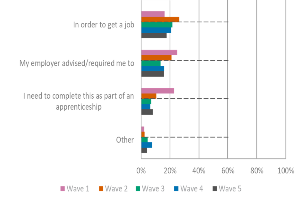 The vast majority of providers (85%, a decrease from 92% in wave 4) reported that they value VTQs, compared to 71% of learners and 45% of employers, which was comparable to wave 4. Approximately two-thirds (68%) agreed that VTQs offer value for money among providers, which was a decrease from 76% in wave 4. This was, however, comparable (not statistically different) to wave 3 (63%).