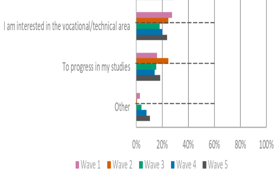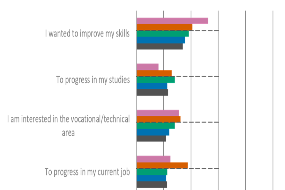 Learners who decided to take VTQs were most likely to say that they did so because they wanted to improve their skills (34%), wanted to progress in studies (23%), followed by interest in the area or progressing in a current job (both 22%).